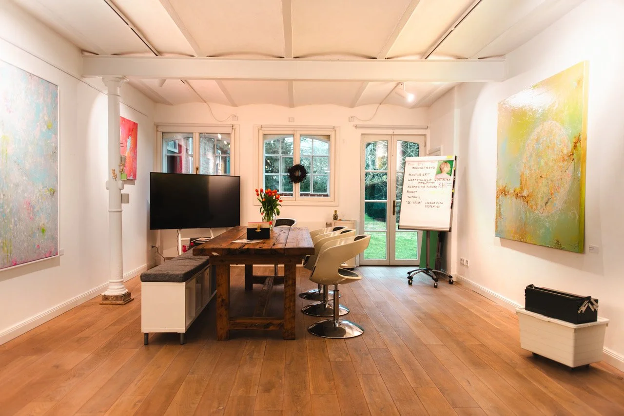 Das neuroästhetische Atelier ist ein Wirkfaktor. Die Umgebung schärft Wahrnehmung, fokussiert den Geist und öffnet Türen, die in Konferenzräumen verschlossen bleiben. Wenn Ihr Thema oder Ihre Situation es erfordern oder ein alternatives Setting sinnvoller ist, findet der Tag in ausgewählten Ausstellungen oder in den Ateliers befreundeter Künstler statt. Diese Orte wähle ich gezielt – immer danach, welcher Raum den größten Impact für deinen Prozess ermöglicht.